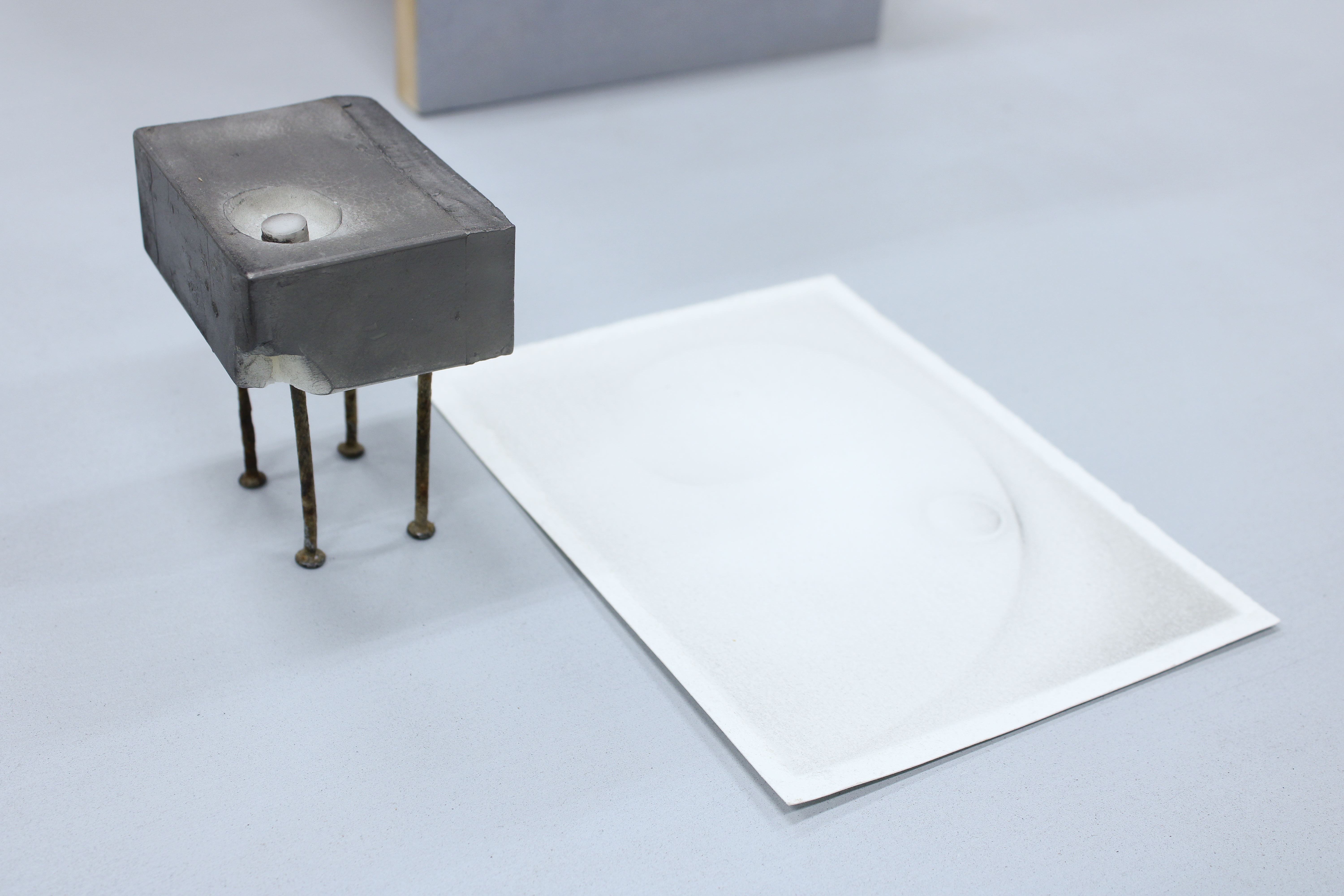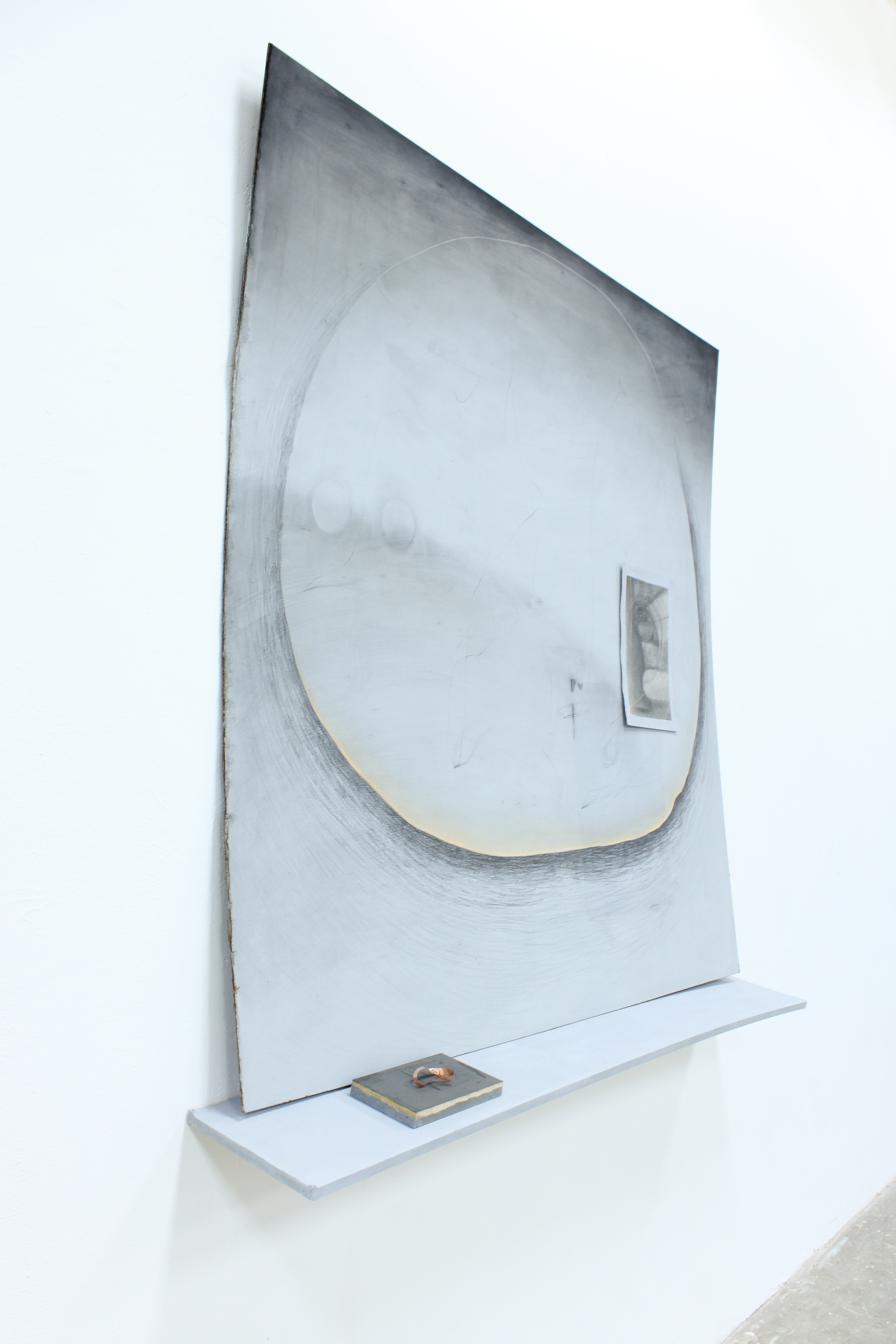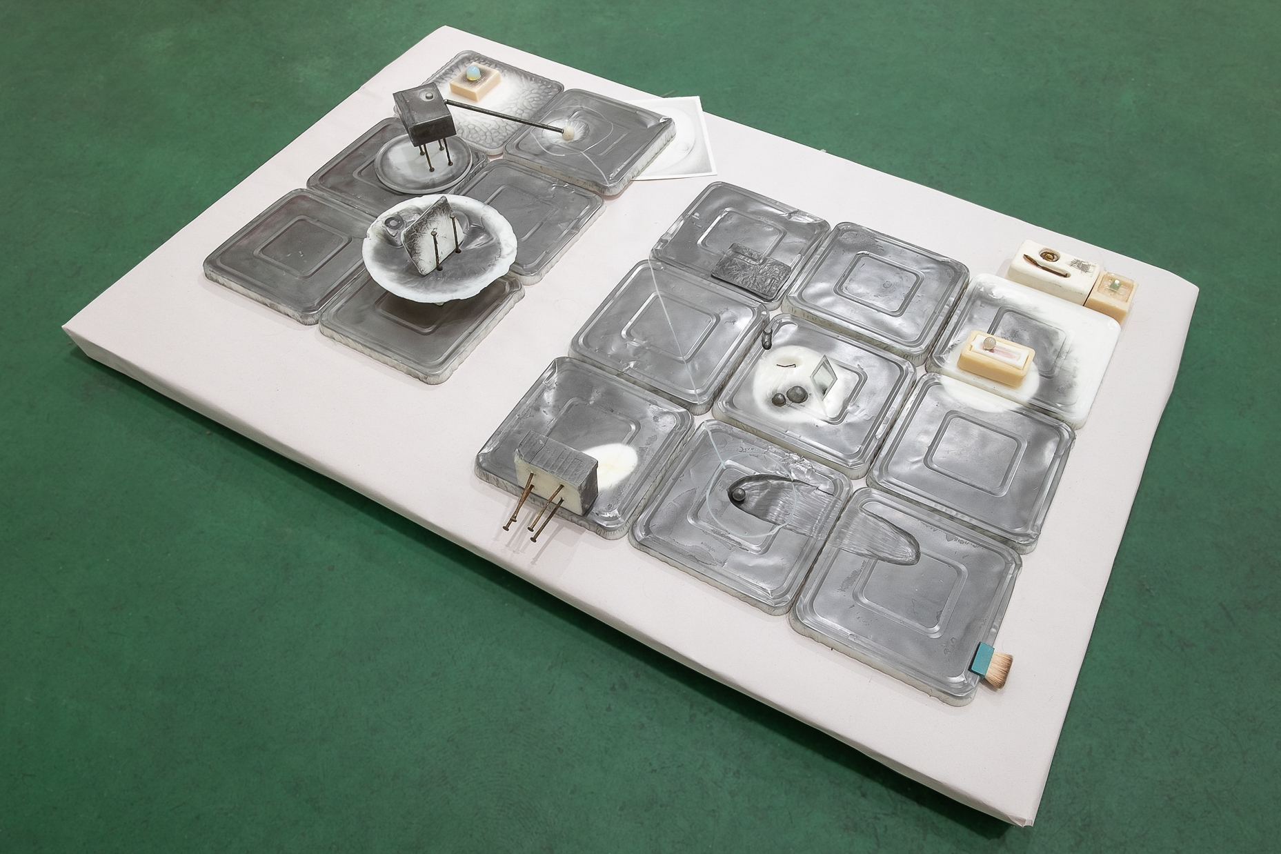 Wax, hand soap, rusted deck nails, cosmetic packaging and brush, eyeshadow, marbles, mirror, graphite, paper