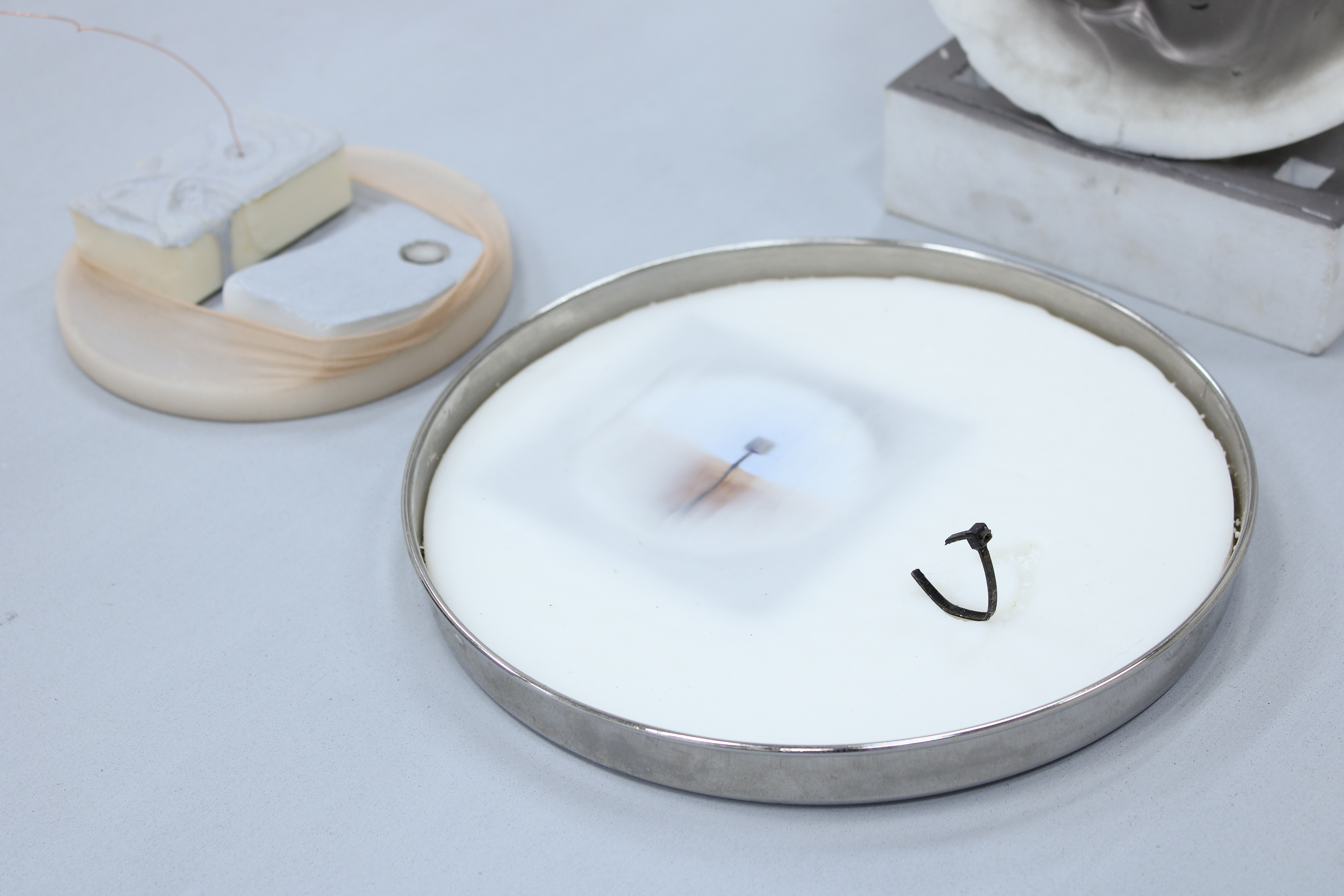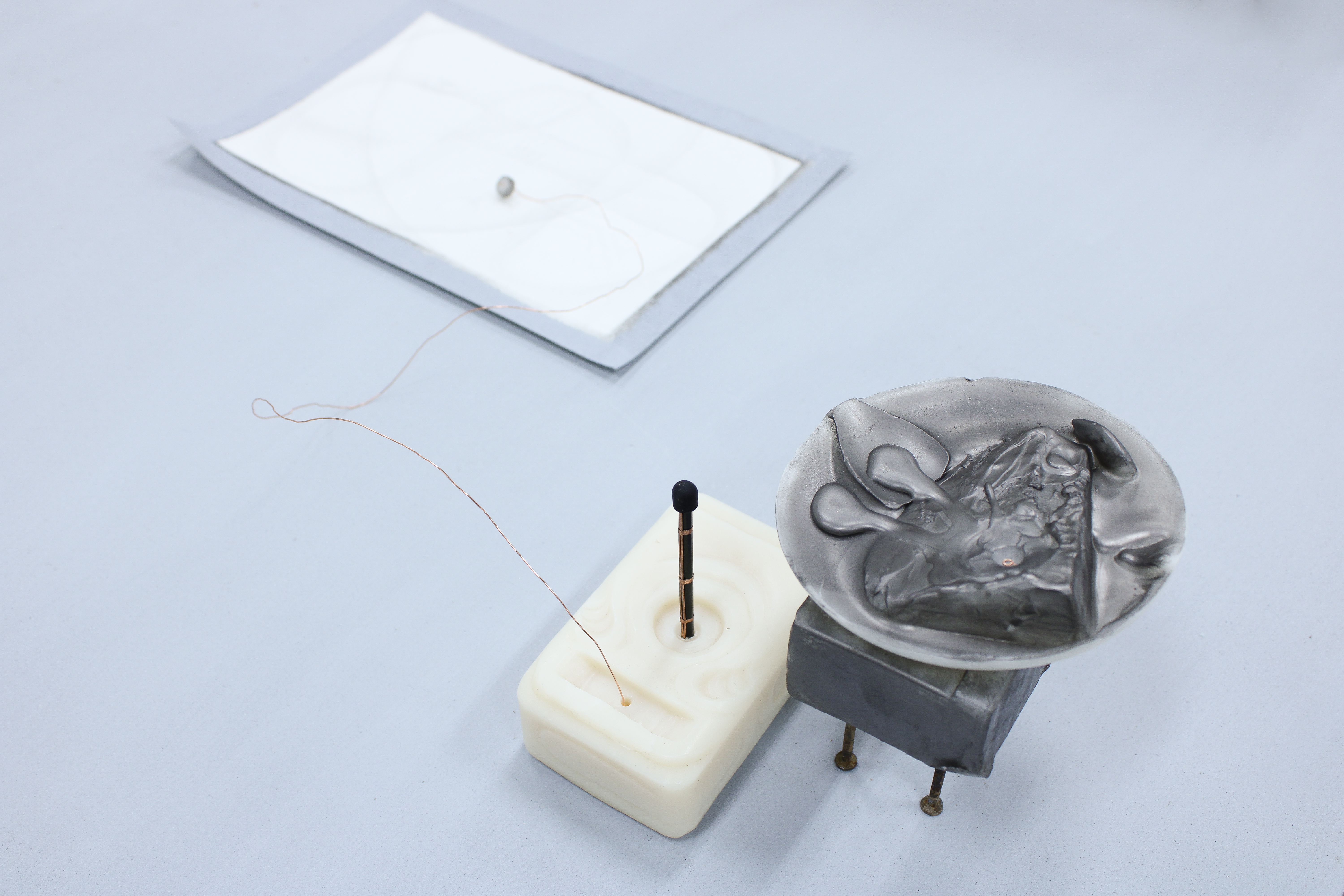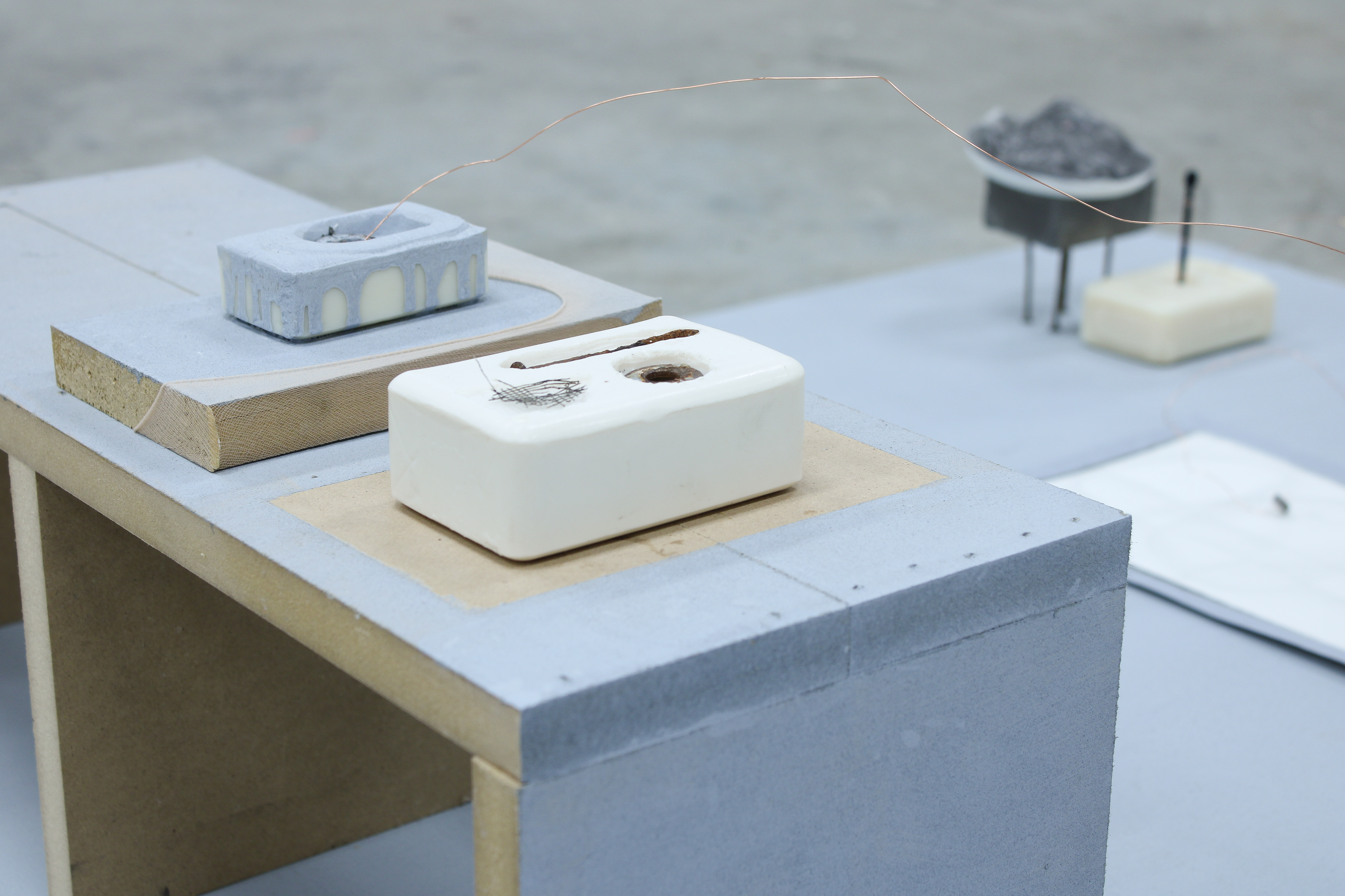 Wax, hand soap, rusted deck nails, cosmetic packaging and brush, eyeshadow, marbles, mirror, graphite, paper