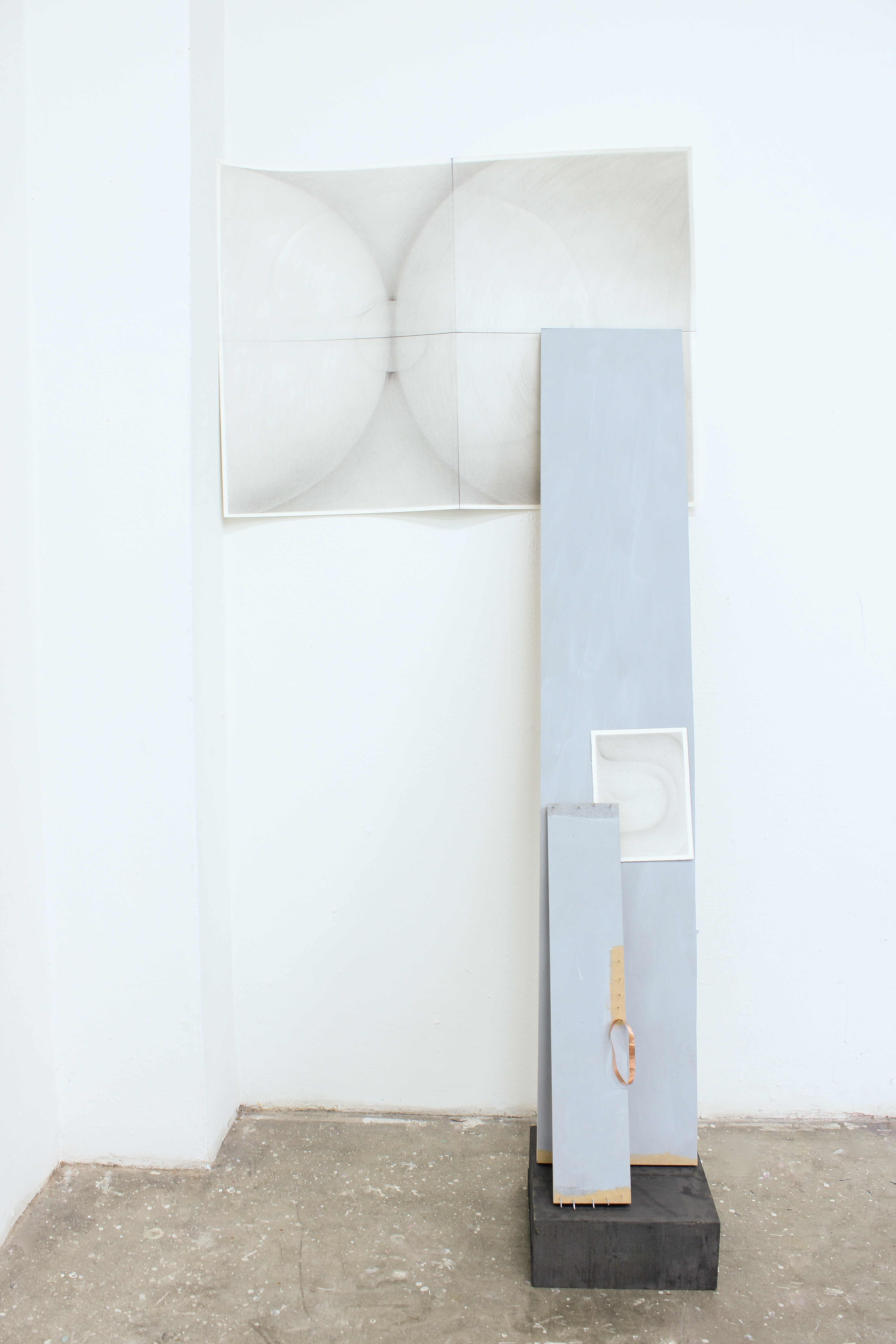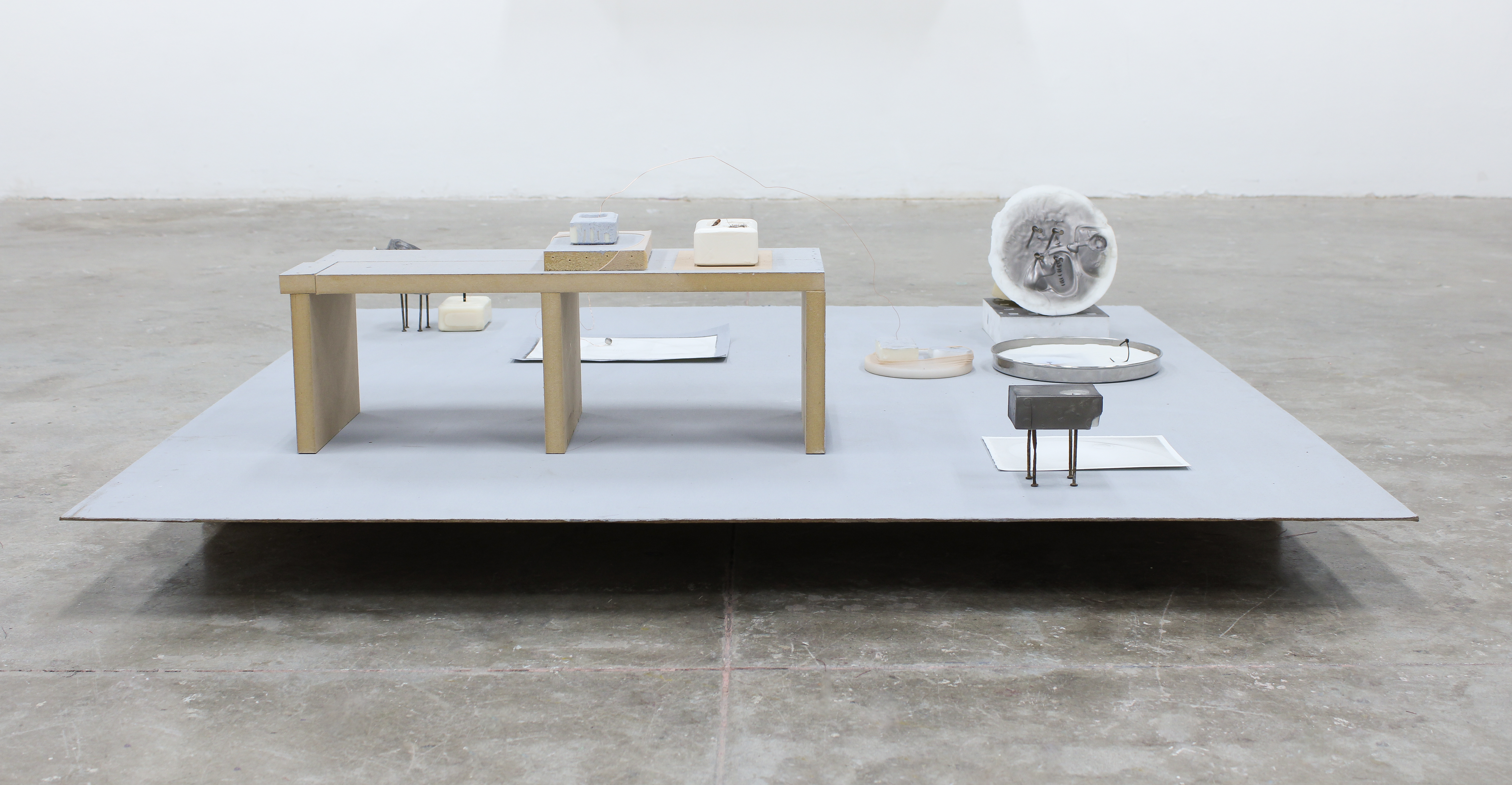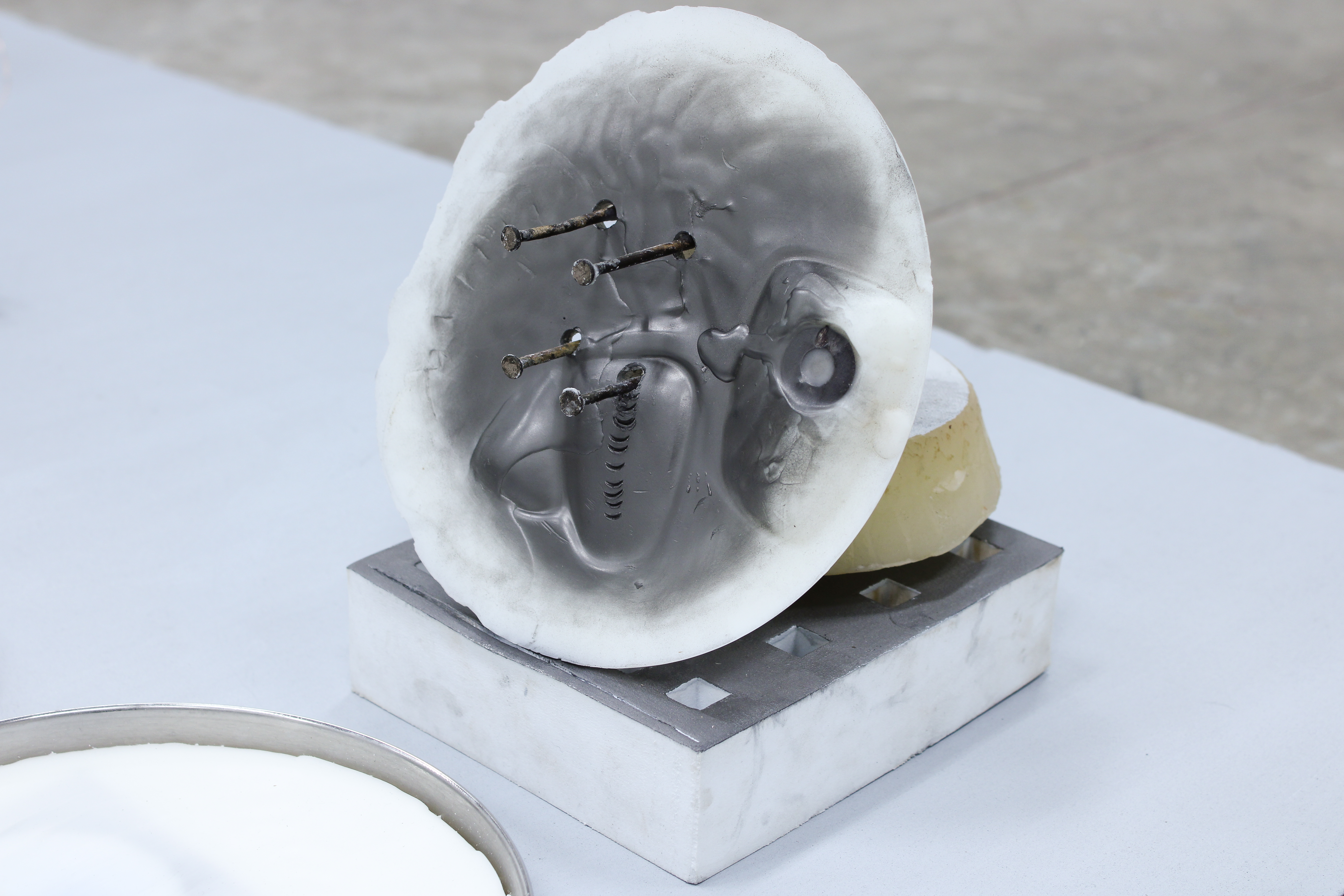Hand soap, wax, rusted deck nails and fasteners, disposable nylon socks, found objects, drawings, graphite, wire